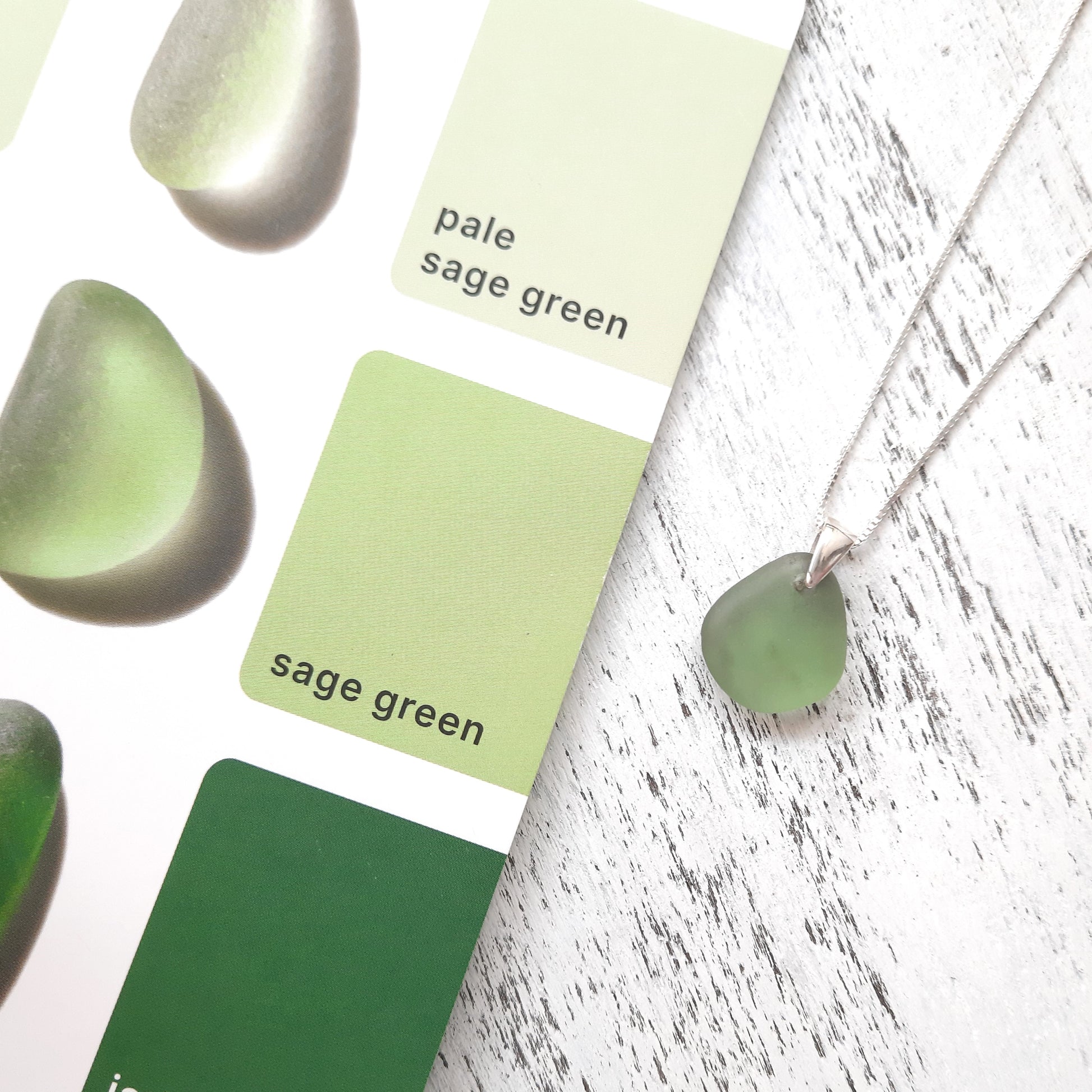 Gargantilla de cadena de eslabones tipo caja de plata esterlina brillante acompañada de un colgante de vidrio marino auténtico de color verde salvia con una bonita forma, sujeto a un pequeño broche de plata.