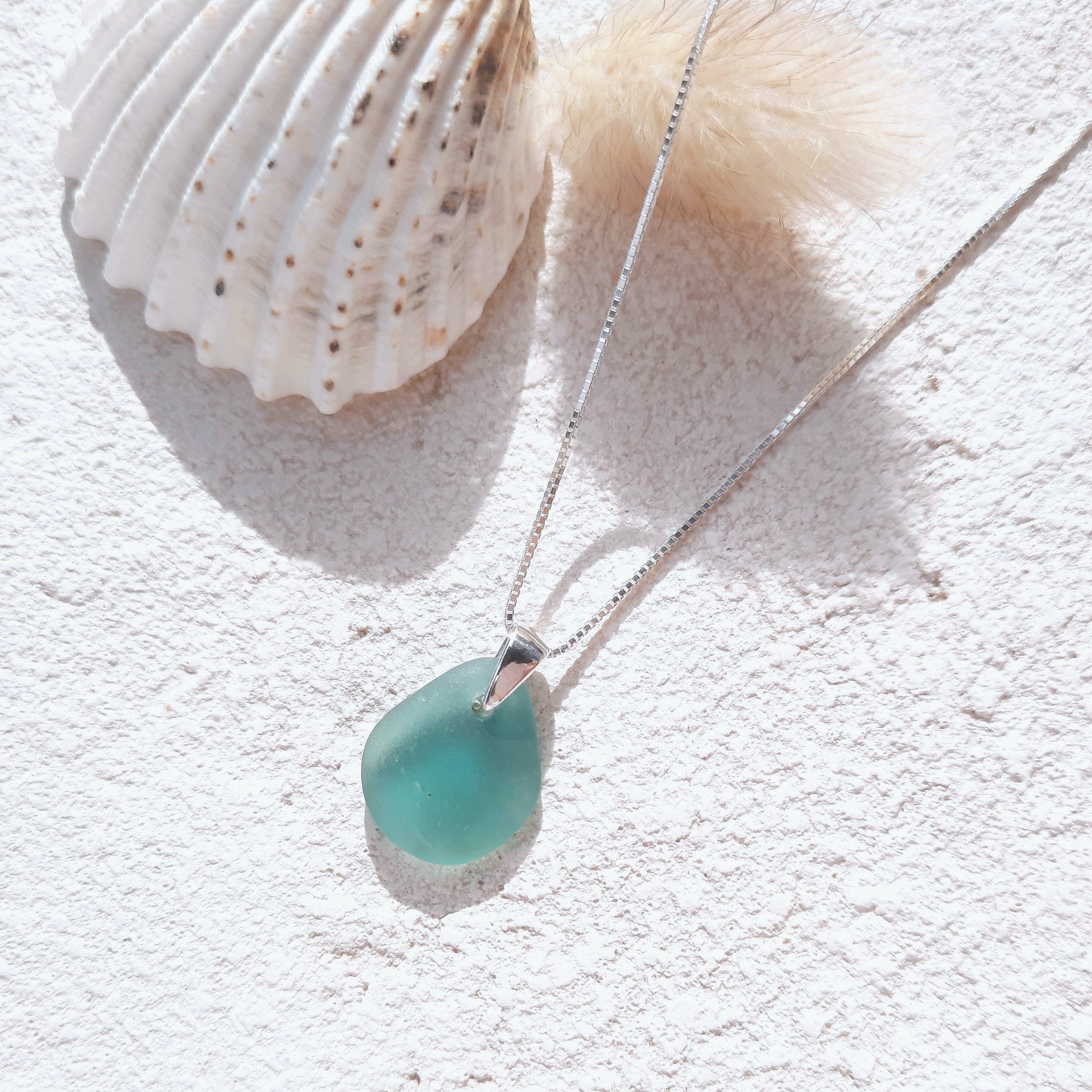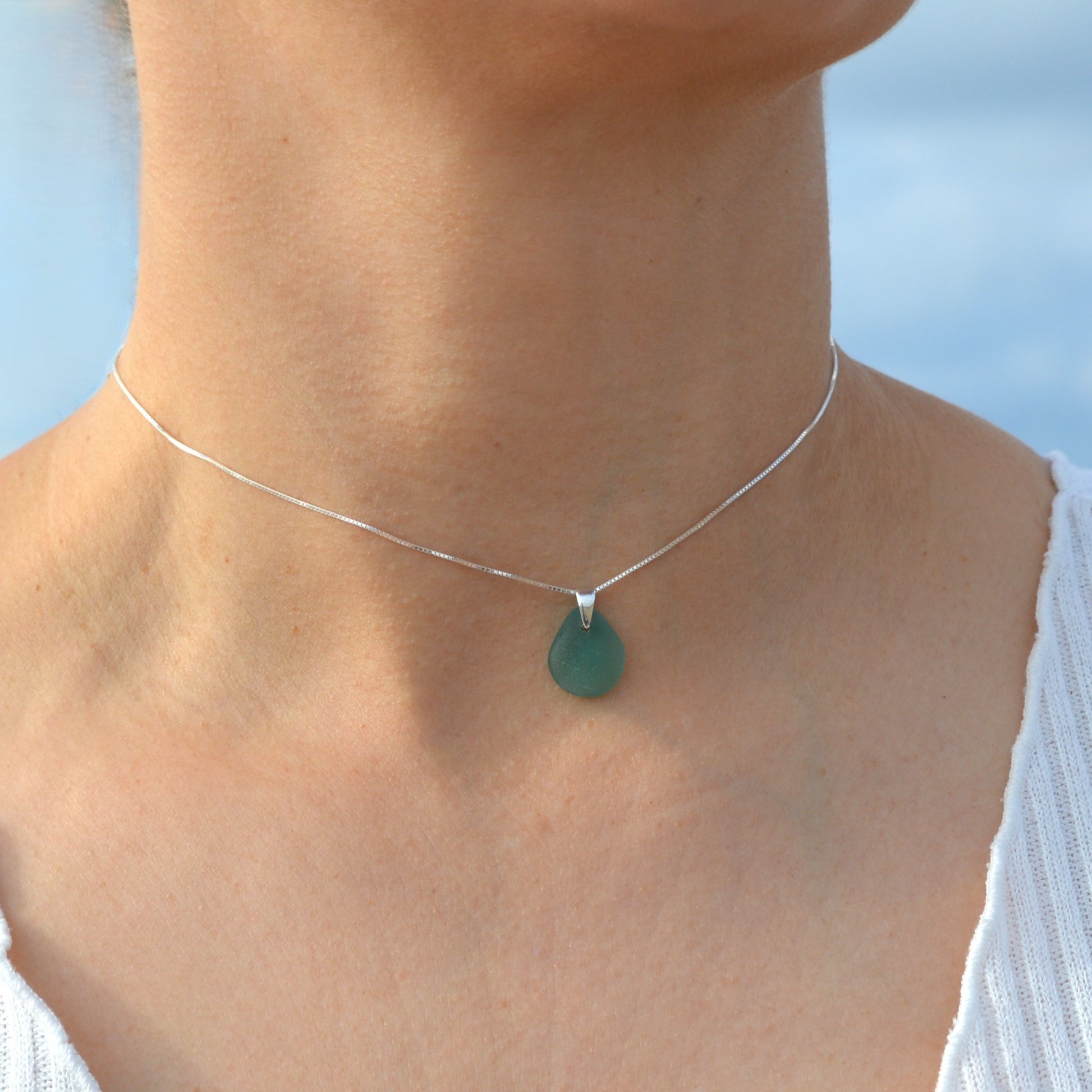 Gargantilla de cadena de eslabones tipo caja de plata esterlina brillante acompañada de un hermoso colgante de auténtico cristal de mar verde azulado unido a un pequeño engarce de plata.