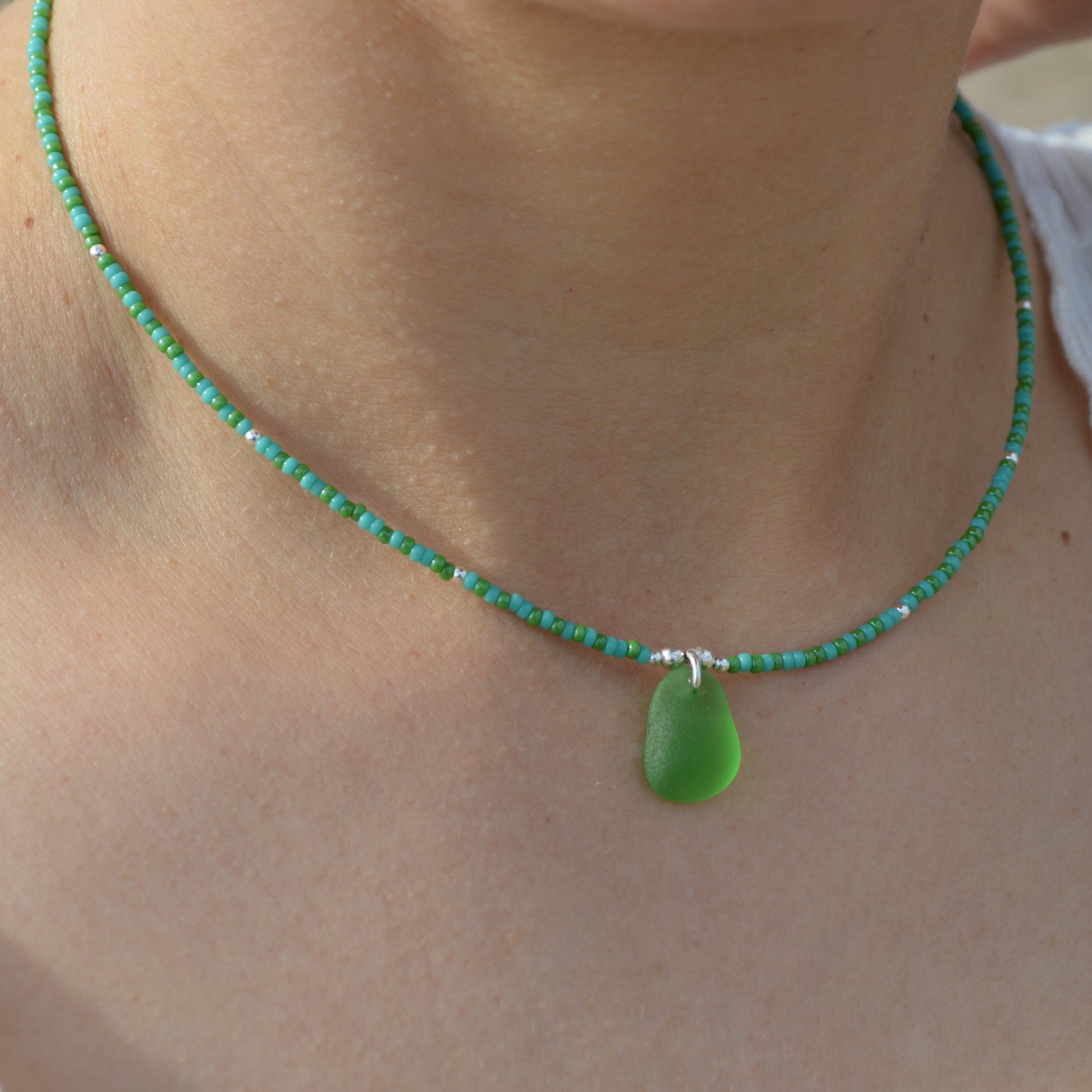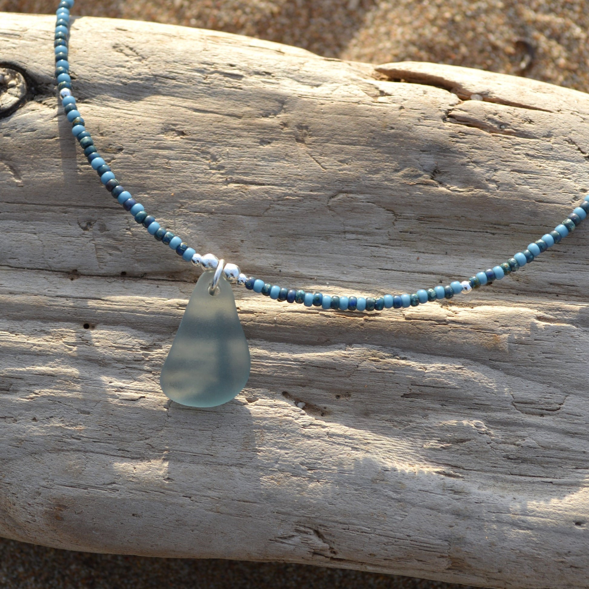 Gargantilla de cuentas de semillas hecha a mano con un auténtico colgante de cristal de mar, inspirada en los colores del océano y la costa. Cada collar es simple, ligero y perfecto para el uso diario o para combinar con otras piezas favoritas. Las combinaciones de colores de las cuentas de semillas están diseñadas para complementar el color del cristal de mar.
