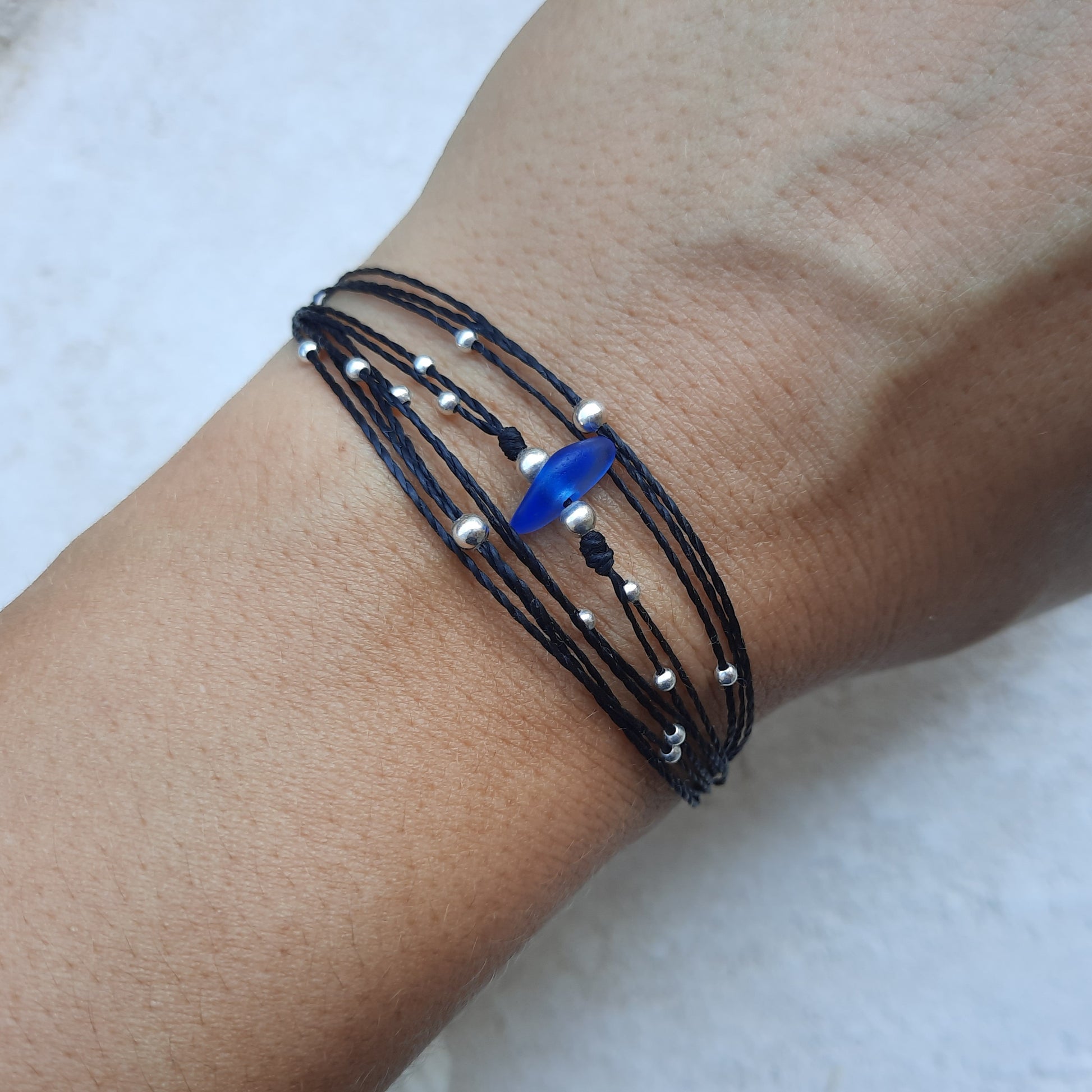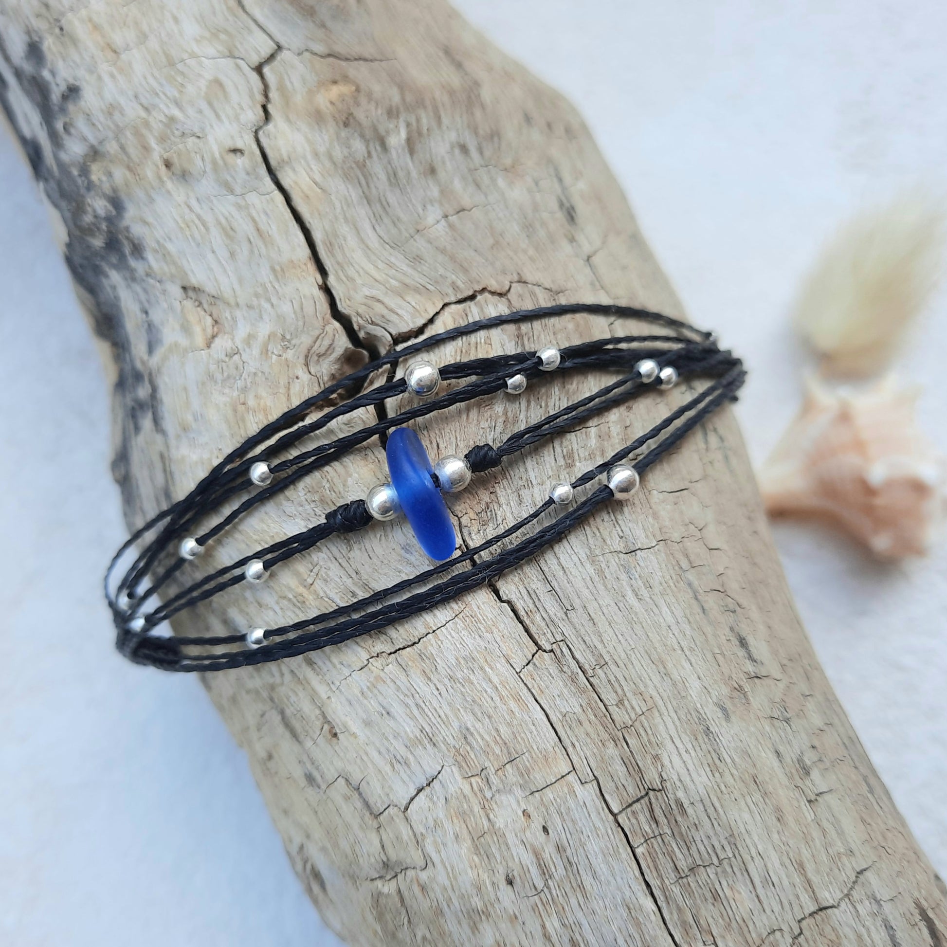 Multi-Strand Black Cord Bracelet with Blue Sea Glass & Sterling Silver Beads