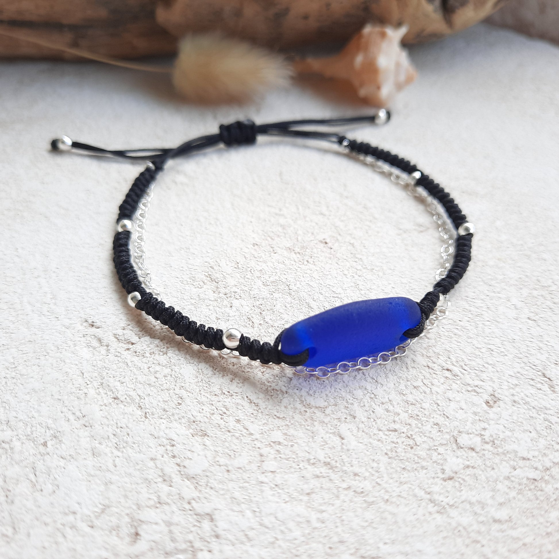 Bring the beauty of the ocean to your wrist with this handcrafted double bracelet that features stunning cobalt blue sea glass paired with a sleek sterling silver chain, sterling silver beads and durable black nylon cord – a perfect blend for everyday wear.