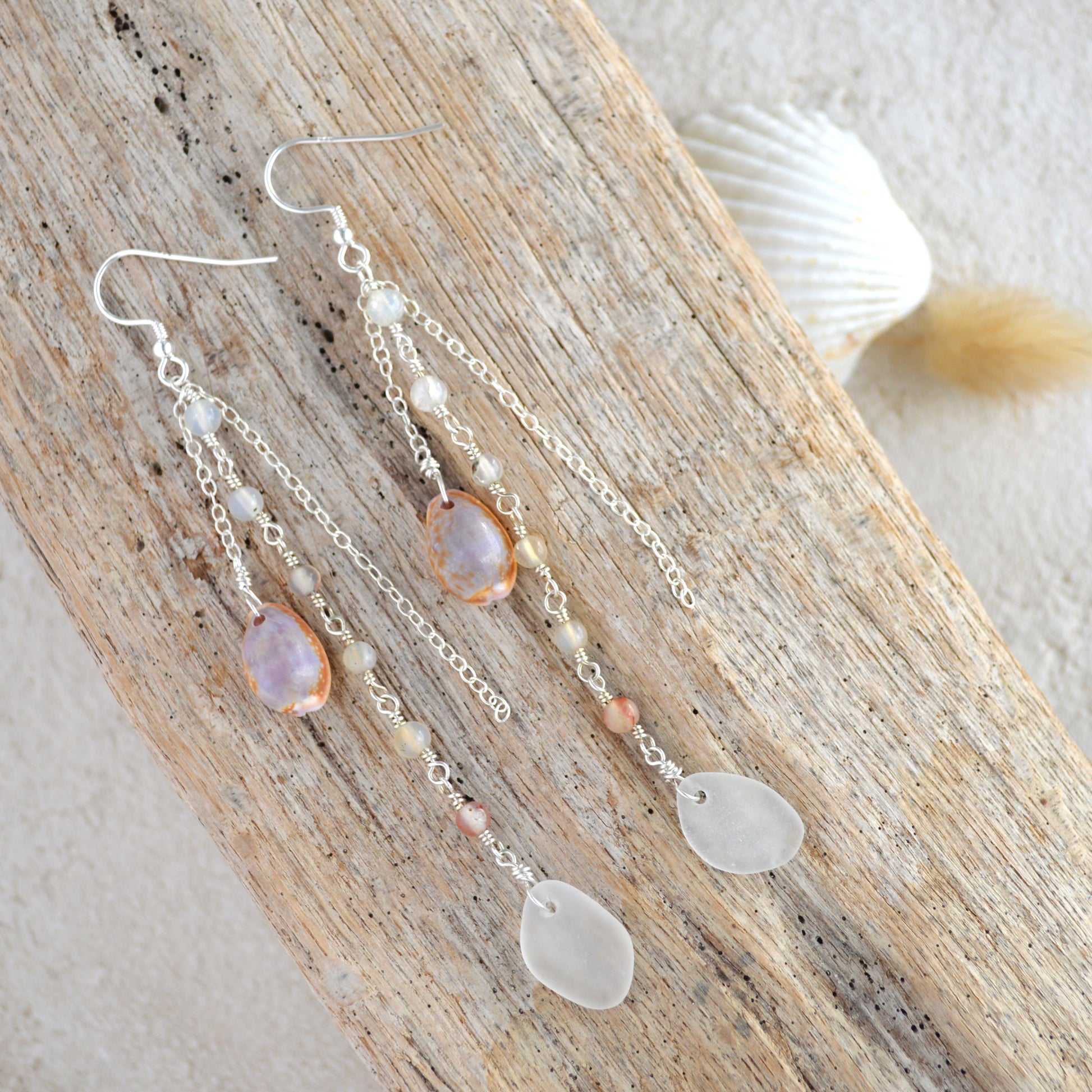 Each earring is made with caramel-toned Hawaiian cowrie shell paired with frosted white Spanish sea glass that catches the light. Delicate, wire-wrapped agate beads in complementing tones add texture and movement, toghether with fine sterling silver chains create an airy cascade.