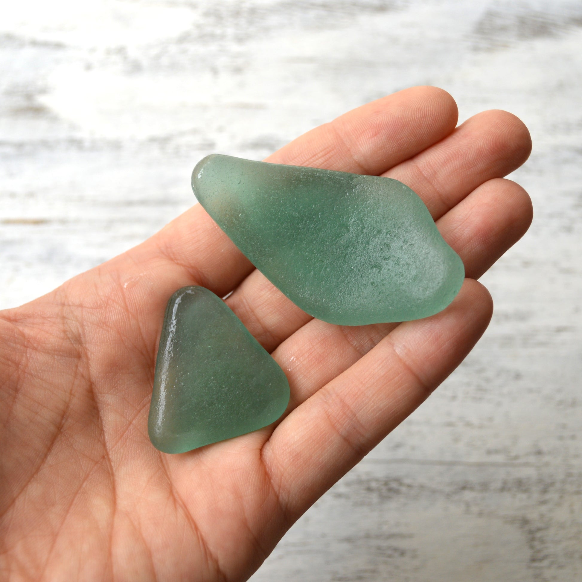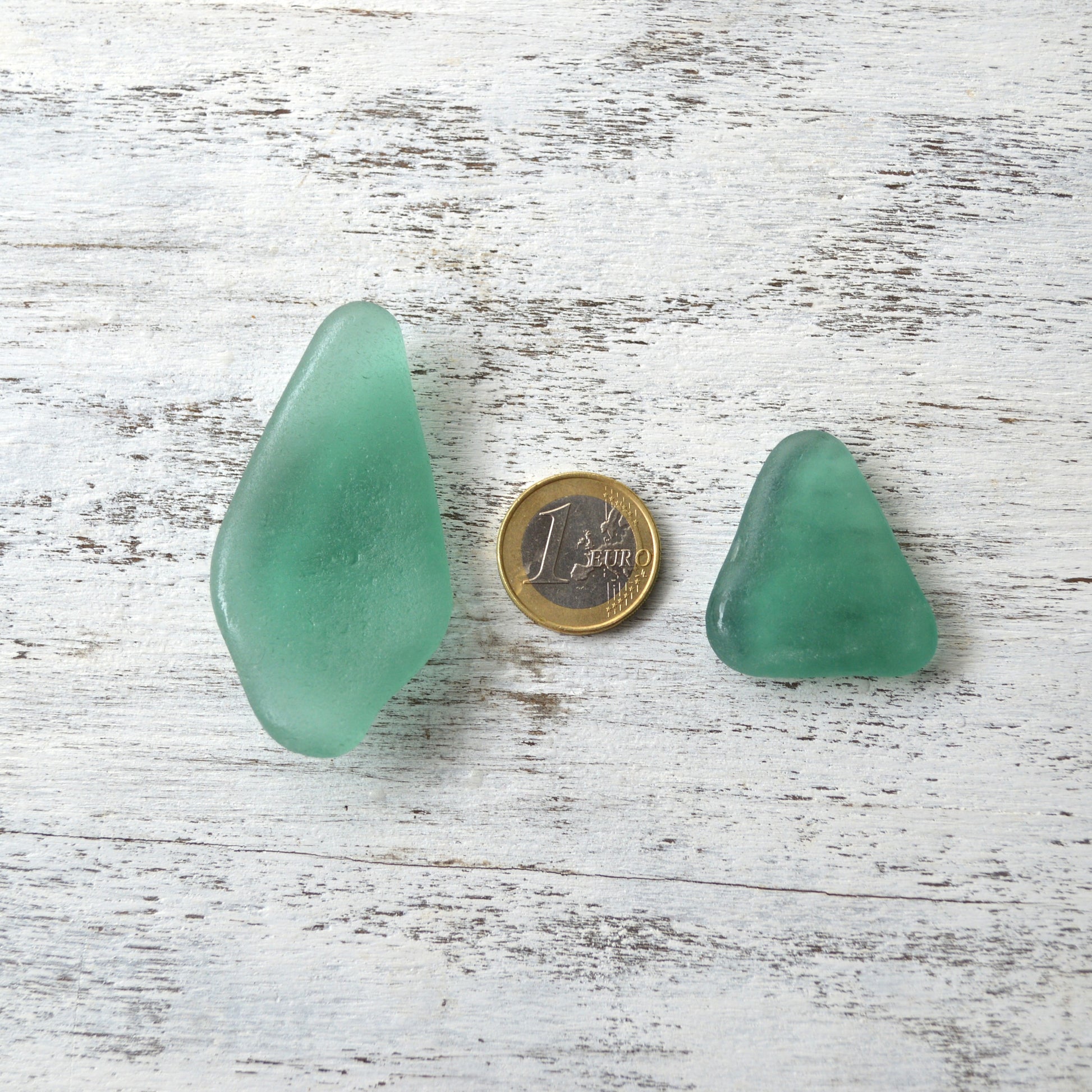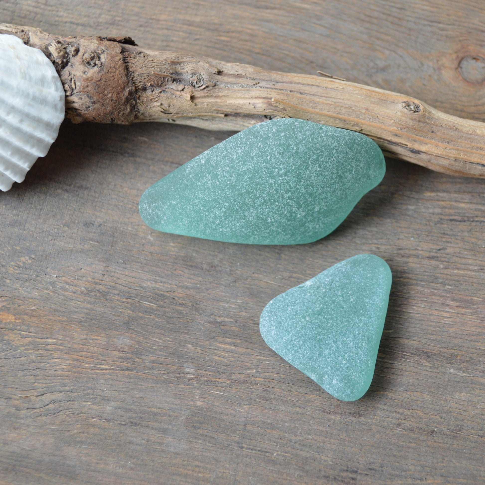 Two beautiful pieces of genuine Spanish sea glass found in rare light teal blue color. Quite frosty when dry and radinat when moistened. Well tumbeled with no chips or imperfections.