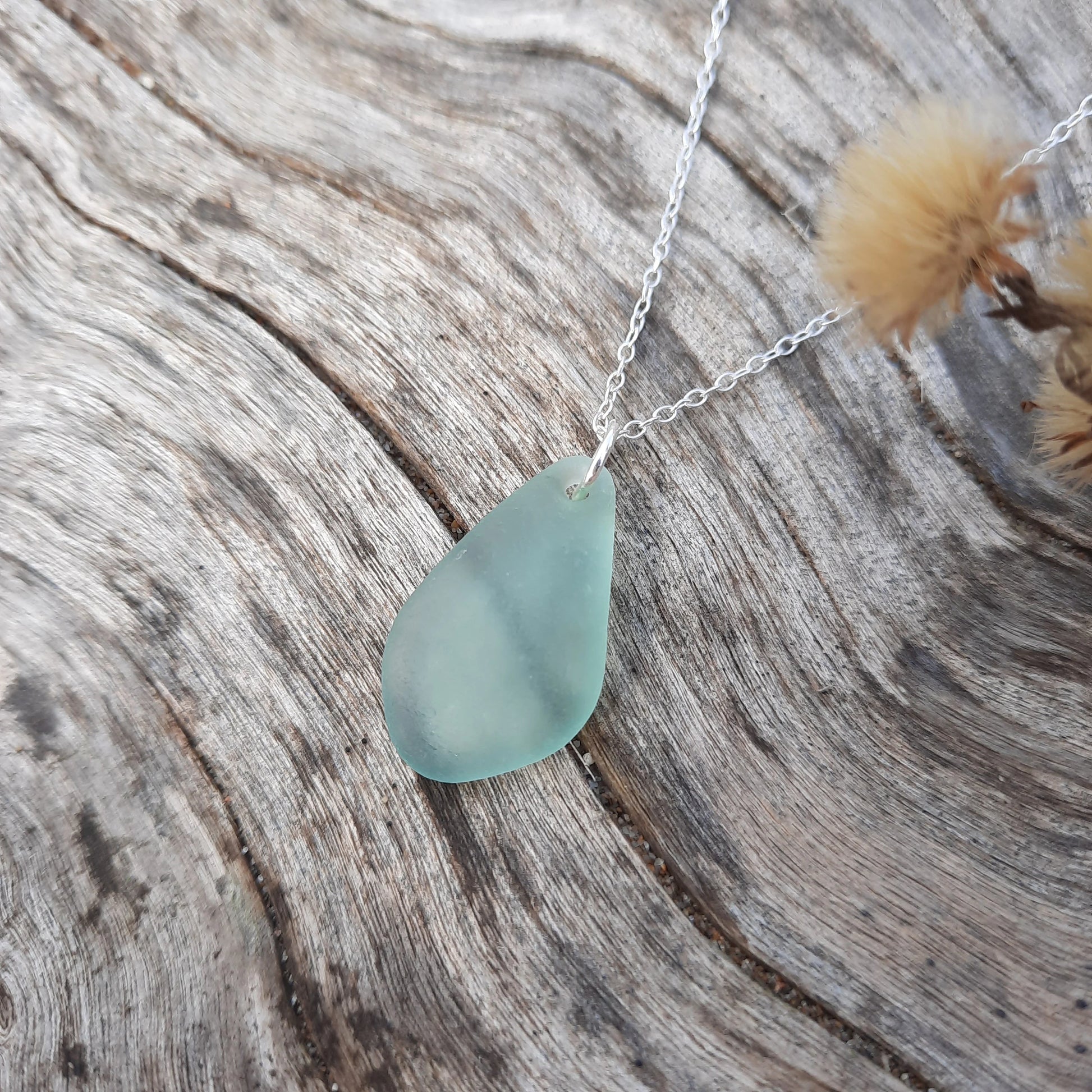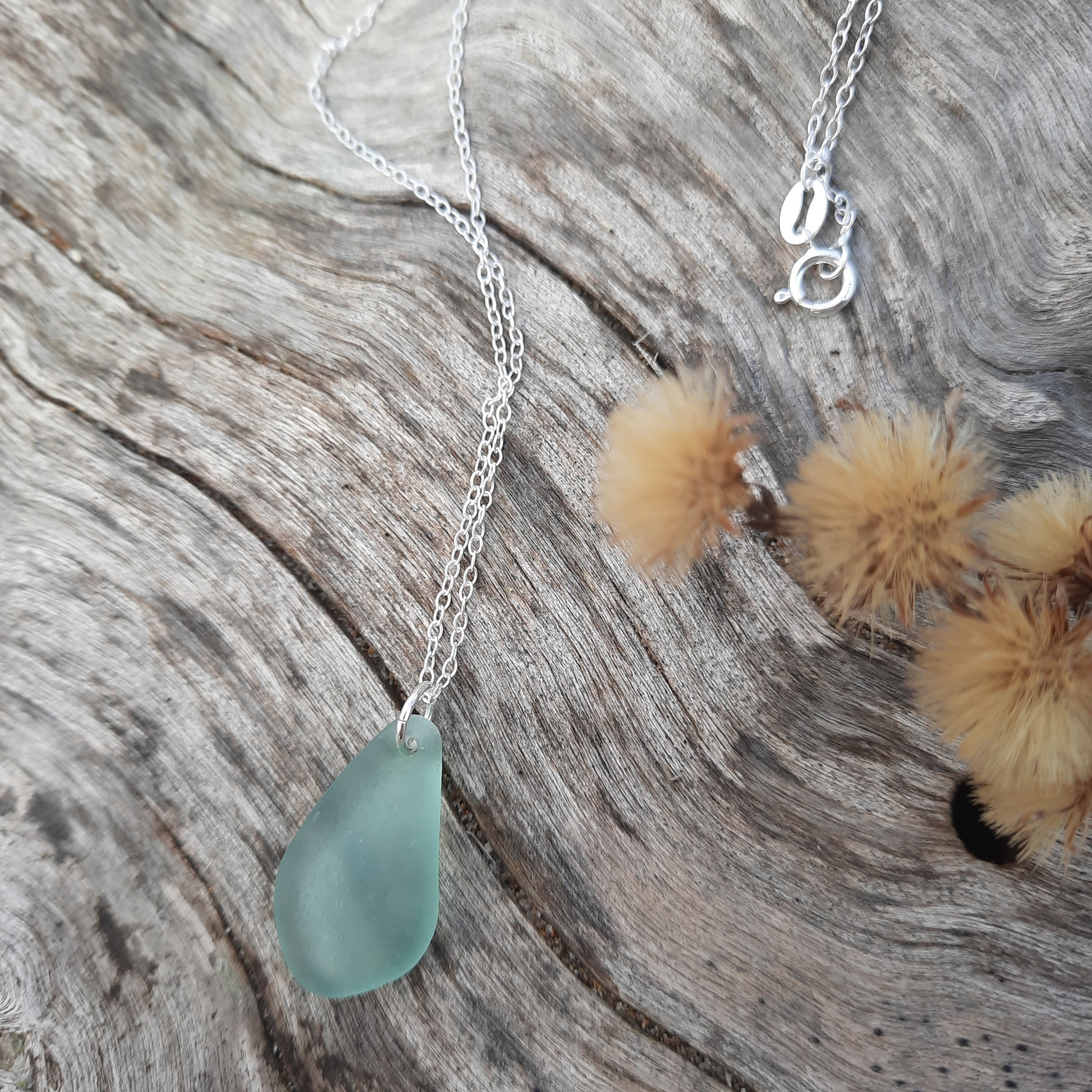 Lightweight 100% recycled silver trace chain necklace accompanied by teal gray authentic sea glass pendant attached on the small silver ring.
