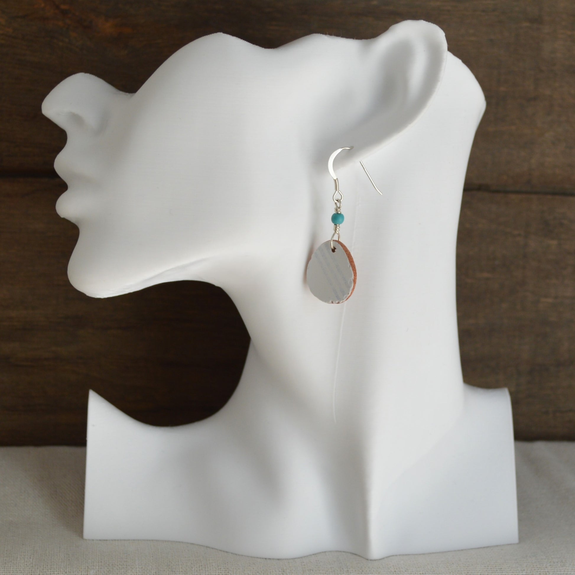 These magnificent, one-of-a-kind earrings feature genuine Spanish sea glass in light seafoam blue color, playfully contrasted with a piece of sea pottery of the same size and shape and enhanced with turquoise beads.